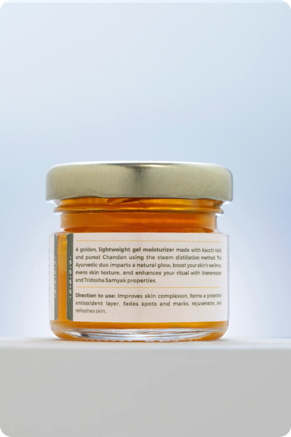 An ayurvedic gel infused with kacchi haldi and pure chandan, crafted through the ancient steam distillation method. This golden lightweight moisturizer naturally enhances skin’s glow, evens out texture, and adds a radiant hue that elevates your daily skincare ritual.